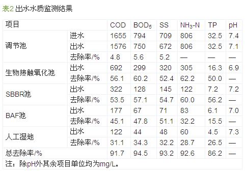 由于豬場沼液的碳氮比低,可生化性差,不適合微生物生長,故定時(shí)向廢水中添加一定量的營養(yǎng)物,以提高B/C。系統(tǒng)運(yùn)行至今,各單元處理效果穩(wěn)定,經(jīng)生物接觸氧化、SBBR、BAF、人工濕地處理后,出水水質(zhì)可滿足《畜禽養(yǎng)殖業(yè)污染物排放標(biāo)準(zhǔn)》(GB 18596—2001)中的相關(guān)要求,監(jiān)測結(jié)果見表2。
